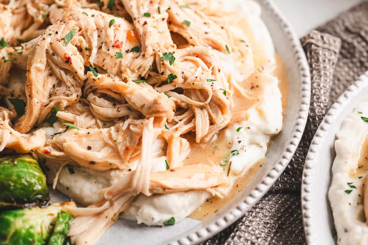 Serve and garnish. Spoon the shredded chicken and gravy over mashed potatoes, and garnish with chopped fresh parsley before serving. Enjoy!