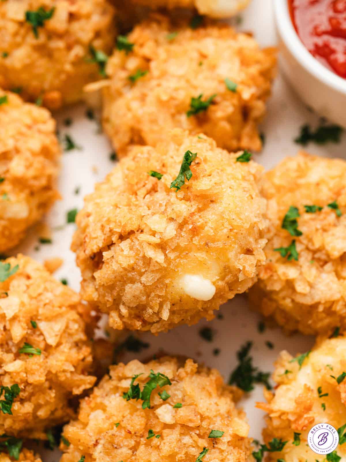Air Fried Babybel Cheese is a bit of a twist on mozzarella sticks, using little circles of Babybel cheese instead of mozzarella. I use crushed potato chips instead of breadcrumbs, which is the perfect complement, adding a bit of salty flavor, but also a super crispy exterior. So, so good!
