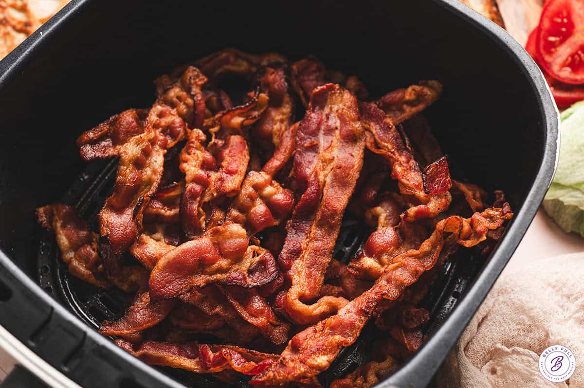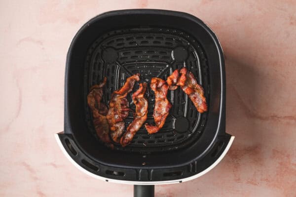 - Air fry at 350 degrees for 8-10 minutes (for extra crispy bacon, air fry an additional 1-2 minutes. Alternatively, for softer bacon air fry for 7 minutes.)