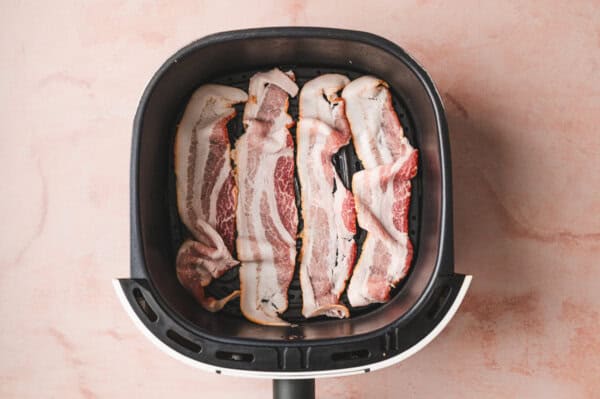 - Don’t crowd the air fryer. I can easily fit 5 slices of bacon in my air fryer. If yours is a different size, you may be able to fit less/more. If needed, the strips can be cut in half. They should not overlap at all.