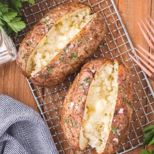 The exact amount of time needed to make air fryer baked potatoes will depend on the size of your potatoes and your air fryer. I find 35 to 40 minutes to be the perfect amount of time, though if you have large potatoes, you may need to increase the cook time. You should be able to easily pierce the potato with a fork without resistance when it’s done