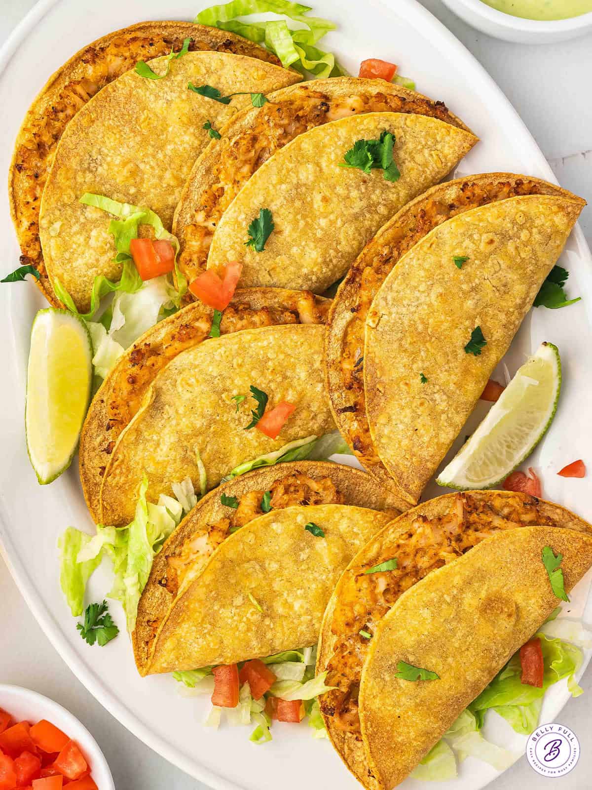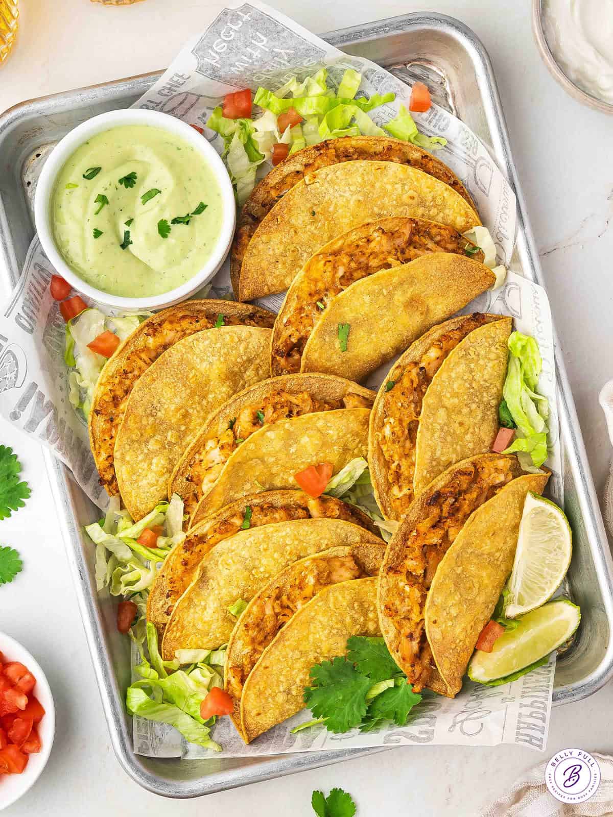 Absolutely. These crispy chicken tacos can easily be made in the oven instead of the air fryer. Just bake the tacos at 400°F for 10-12 minutes. Make sure to flip halfway through for even crispiness.
