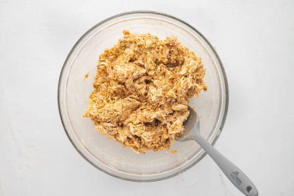 - In a bowl, prepare the filling by mashing 1/4 cup softened cream cheese until smooth, then mix in 1 cup shredded Mexican cheese, 1-ounce packet taco seasoning, and 2 cups shredded chicken until well combined and creamy.