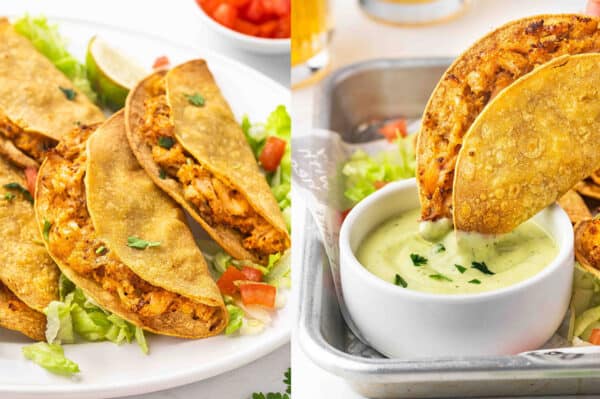My family loves tacos. Shredded chicken tacos, Baja steak tacos, birria tacos…we love them all. These air fryer chicken tacos are our new favorite and now in permanent rotation. They’re so cheesy and creamy on the inside, a very satisfying crunch on the outside, and super easy to make. Plus, they’re ready in less than 20 minutes. I highly recommend serving these with the creamy avocado-lime dipping sauce. It’s so good and the perfect accompaniment to the crunchy tacos.