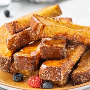 As I noted in my French toast recipe, the best bread to use for French toast or French toast sticks is challah bread. It’s thick, durable, and won’t lose its form when dipped in the custard. Brioche, sourdough, French bread, and Texas toast are all good alternatives as well.