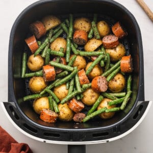 Enjoy an easy, flavor-packed, high-protein meal with this Air Fryer Kielbasa and Veggies recipe. Smoked sausage, tender baby potatoes, and crisp green beans are well seasoned and air-fried to perfection for an all-in-one lunch or dinner in just 15 minutes!