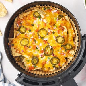 These easy nachos are best served as soon as they come out of the air fryer. They’re not ideal for making hours in advance, as the ingredients will cool and the tortilla chips can become soggy. However, you could assemble them in advance and then pop them in the air fryer, as long as none of the toppings are “juicy”. If you are adding meat, I would not recommend this option.