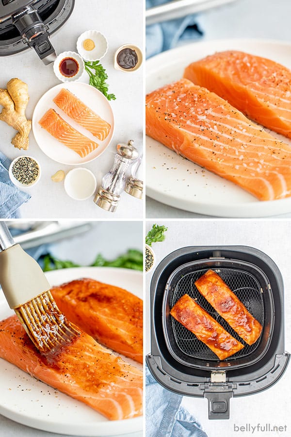 - Air fry at 400 degrees F for 6 minutes. Brush the glaze all over the salmon and continue air frying for another 5 to 6 minutes or until an internal temperature reaches at least 145 degrees F.