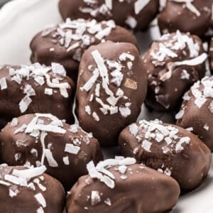 Medjool dates are stuffed with almond butter and a whole almond, then dipped in chocolate and topped with coconut flakes. Medjool dates are naturally sweet, which gives these a dessert-like quality without adding sugar, and the chocolate, almonds, and coconut give you all the flavors of the classic candy bar.