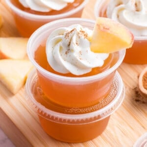 These apple pie jello shots are exactly what you need to make your next fall party a little more fun! The apple cider gives them the warm, spiced apple pie flavors, while the apple whiskey adds a boozy touch. Then they’re topped with whipped cream and cinnamon, so they double as both a dessert and an adult beverage.