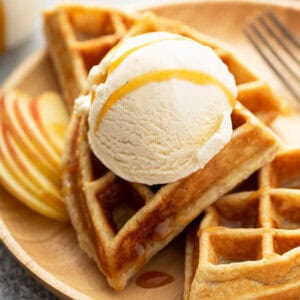 - Serve waffles with a dollop of whipped cream, a scoop of ice cream, and homemade caramel sauce. Garnish with more fresh apple.