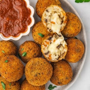 With a creamy, cheesy risotto filling and breaded crispy outside, this Arancini recipe makes the best fried Italian rice balls. I like to serve them with marinara sauce for a restaurant-quality appetizer any time!
