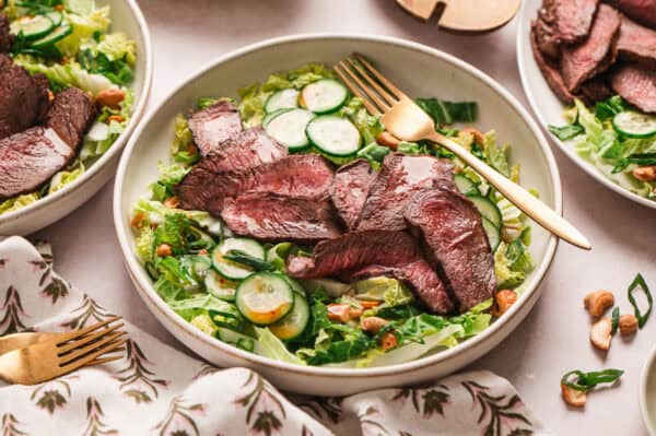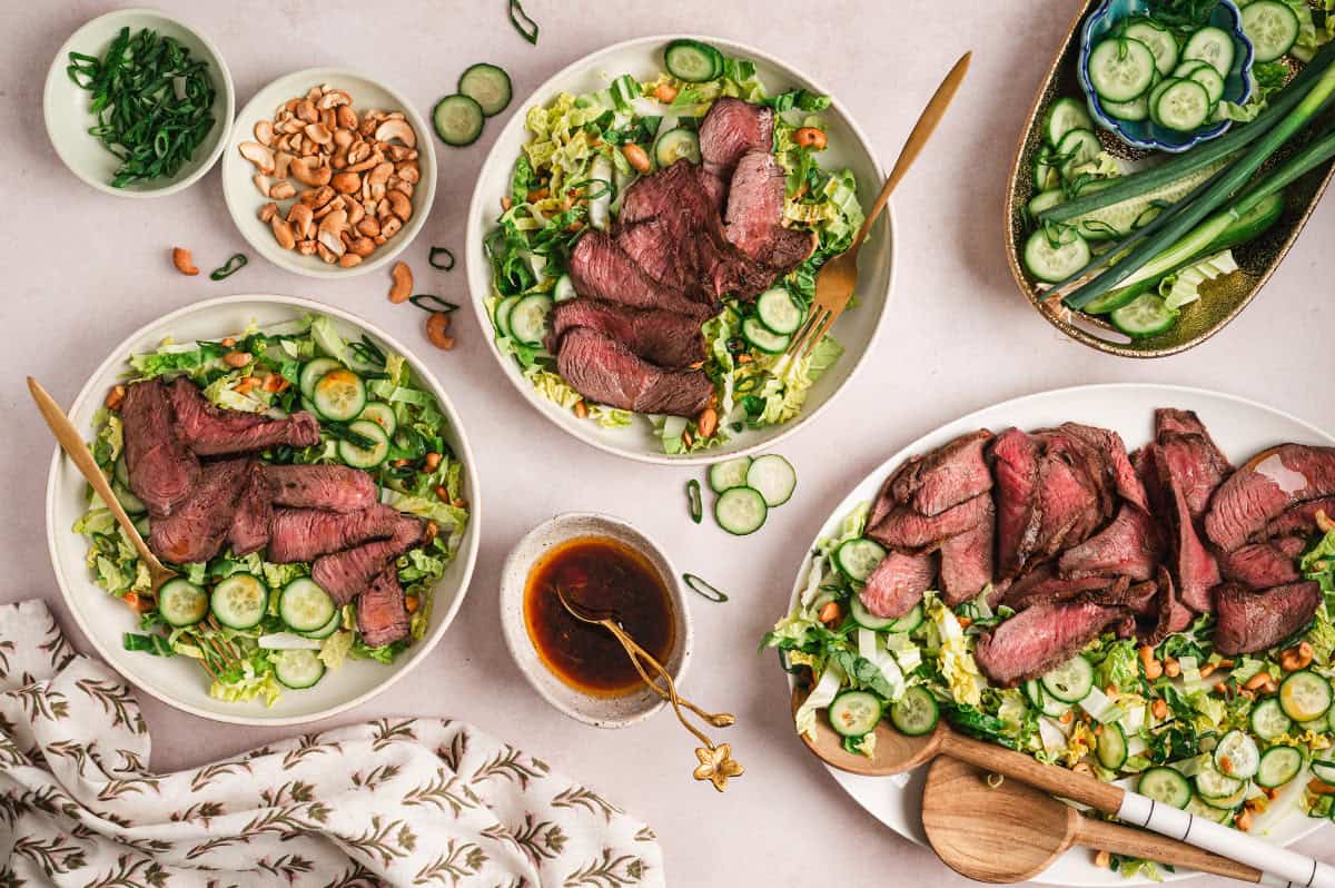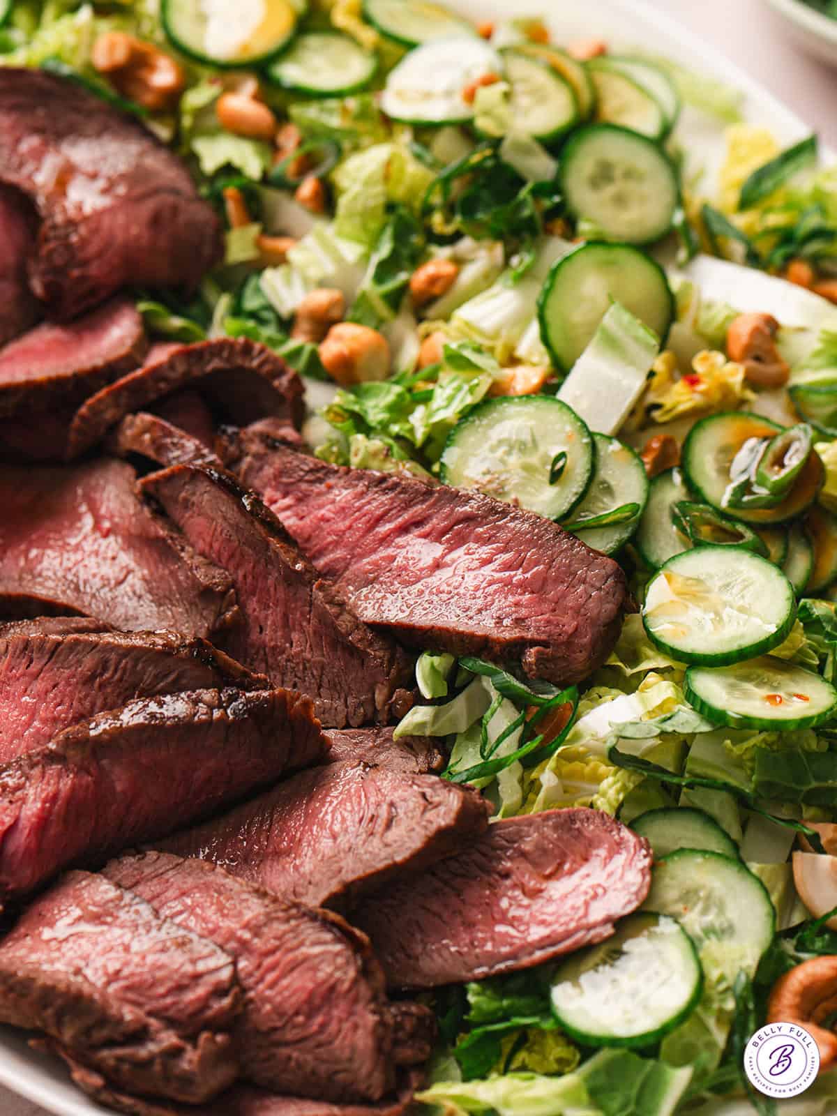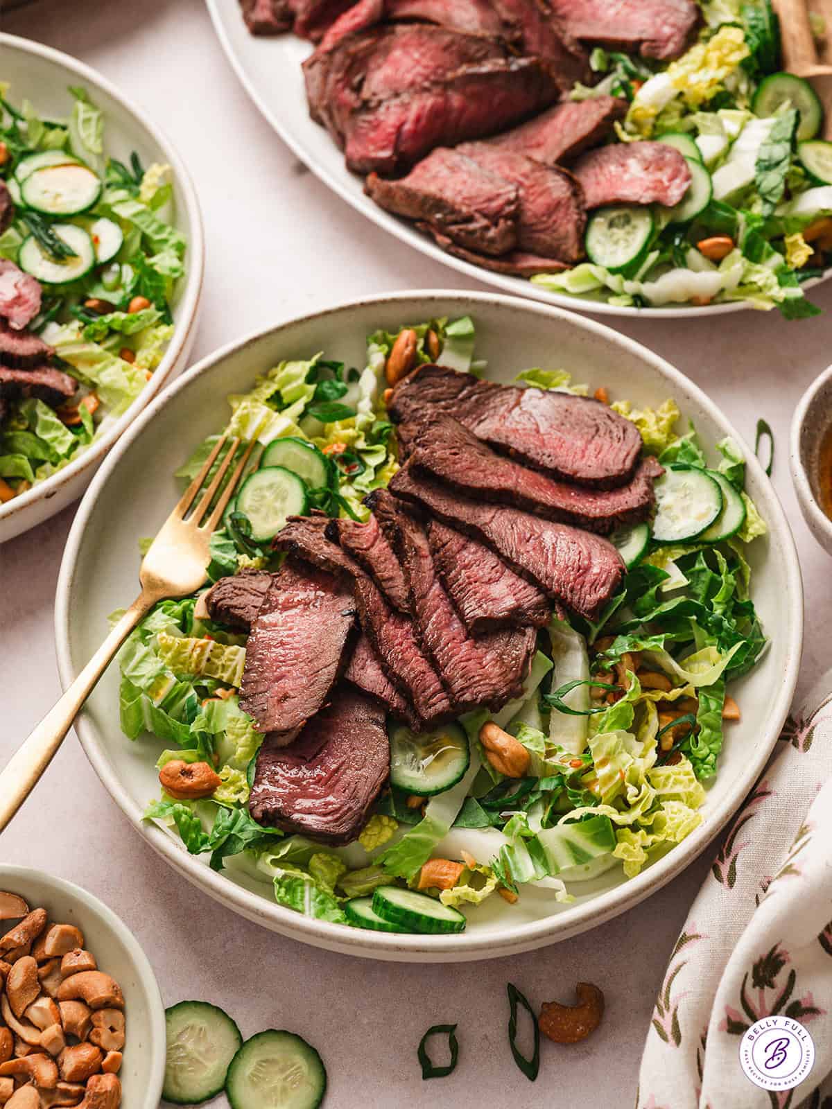 Marinated grilled steak is served over a cabbage and cucumber salad, drizzled with a simple, but flavorful homemade Asian dressing and sprinkled with roasted cashews. This easy Asian Steak Salad recipe is a fantastic complete meal, great for lunch or dinner!