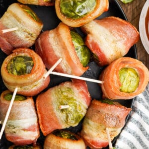 Depending on the occasion, I will either serve these brussels sprouts wrapped in bacon in a bowl as they are or add some toothpicks for a grab-and-go appetizer option – they work great for parties, holidays, and game days.