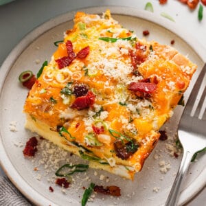 - Sprinkle with a bit of fresh Parmesan, the reserved crispy bacon, and a few more diced scallions for color. Cut into squares ad enjoy!