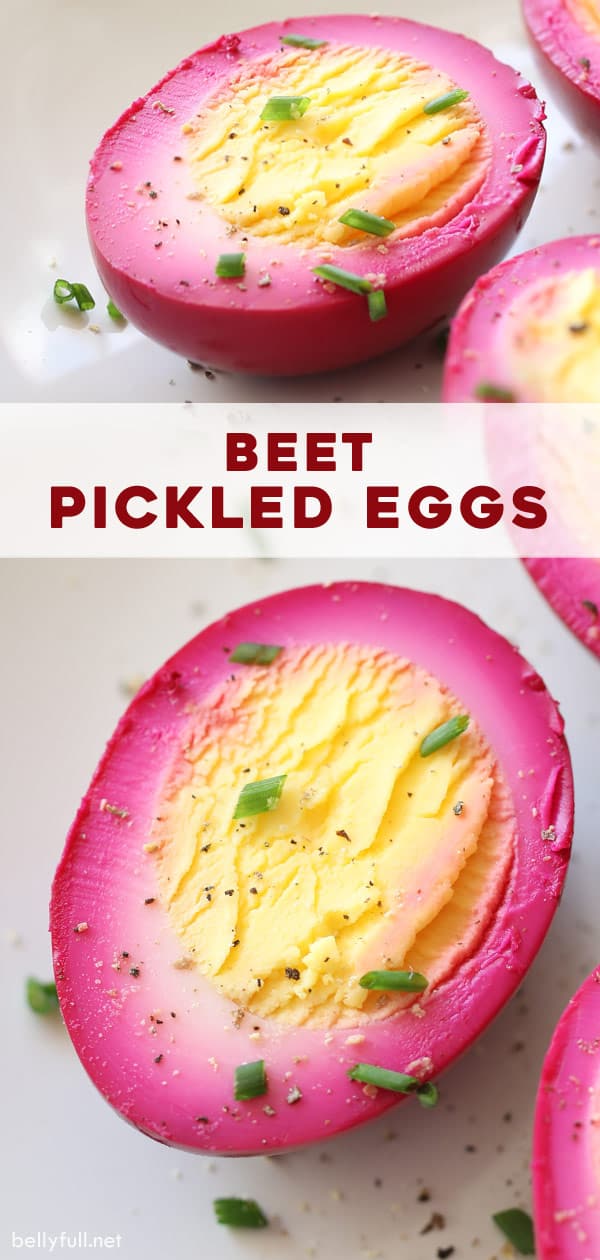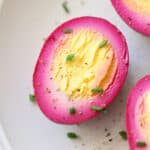 We love these beet eggs with a little sprinkle of pepper and chopped chives, which is a great protein-packed breakfast or afternoon bite. They’re also so pretty on a buffet table served as an appetizer. But they are also wonderful on sandwiches or sliced over a simple salad.