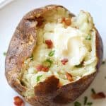 The perfect baked potato barely needs any toppings, but I like a dab of butter, sour cream, and scallions on mine. My kids love theirs with cheddar cheese. And we all love bacon crumbles!