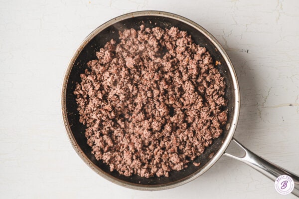 - Cook the beef: Warm a large nonstick pan over medium-high heat. Once hot, spray with nonstick spray and add 1 pound lean ground beef. Cook, undisturbed for 1 to 2 minutes, so it can develop a nice char. Then sautรฉ, breaking it up into very tiny crumbles, until cooked through and no pink remains. Drain off the fat, then season with 1 teaspoon coarse salt, 1/2 teaspoon pepper, and 1/4 teaspoon garlic powder. Transfer beef to a shallow bowl to cool slightly.