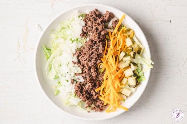 - Assemble the salad: In rows, divide 6 cups shredded iceberg lettuce between 4 salad bowls (about 1 & 1/2 cups each.) Top with about 1/3 cup cooked beef crumbles, shredded cheddar cheese, diced onion, and pickles.