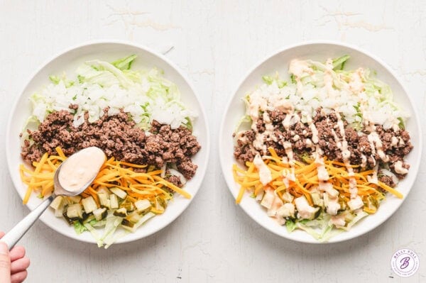 - Drizzle about 3 tablespoons of the Big Mac sauce over each salad.