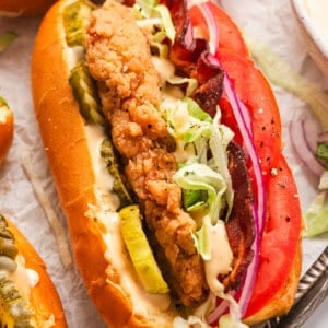 - Assemble the sandwiches – spread the sauce on both insides of the bun, add the chicken strip(s), bacon slices, lettuce, onion, tomato, and pickles.