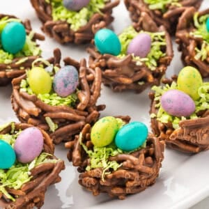 These Bird’s Nest Cookies are such a fun no-bake dessert for spring and Easter! They’re made with crunchy chow mein noodles tossed with chocolate and peanut butter, shredded coconut, and M&M eggs. They’re so easy to make! The only “cooking” required is melting the chocolate.