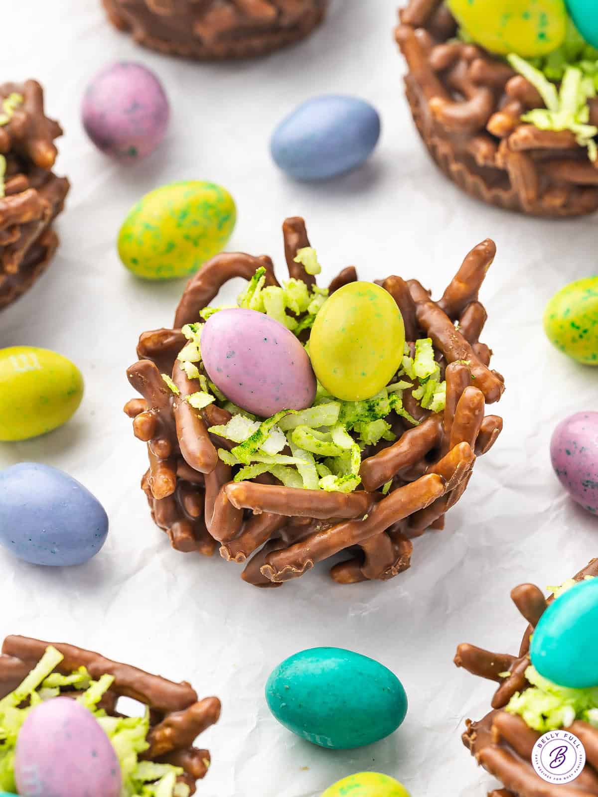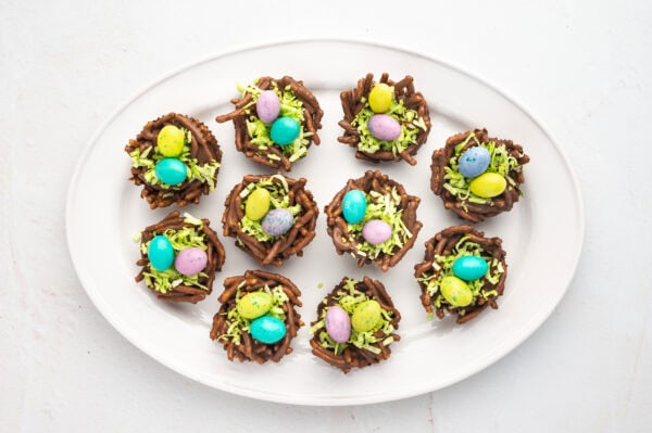 - Gently remove nests from the paper liners and top each with 2 M&M eggs. Enjoy!