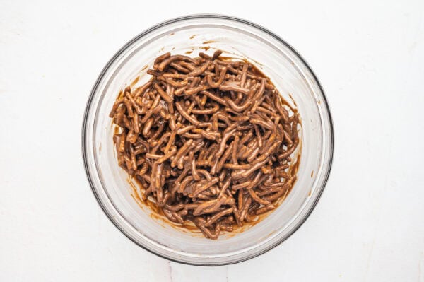 - Add in 2 cups crunchy chow mein noodles and stir to combine until coated.