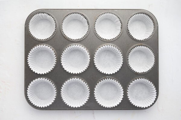 - Line a 12-cup muffin tin with paper liners. Set aside.