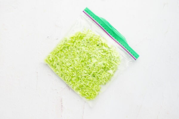 - Place 1 cup sweetened coconut flakes in a plastic bag with 1-2 drops of the green dye. Toss gently until the coconut is coated and a nice light green color. Set aside.