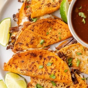 For this Birria Tacos recipe, the tender juicy shredded meat is layered with gooey cheese and a few toppings, tucked into folded corn tortillas that are dipped into the birria broth, and then pan fried to crispy perfection. They’re incredible.
