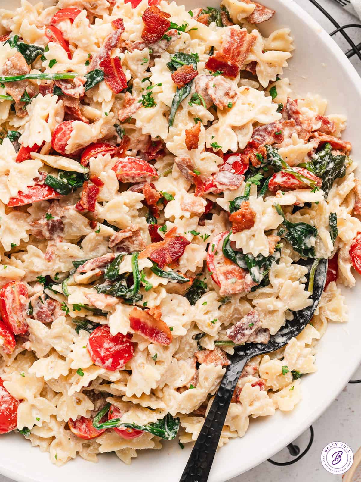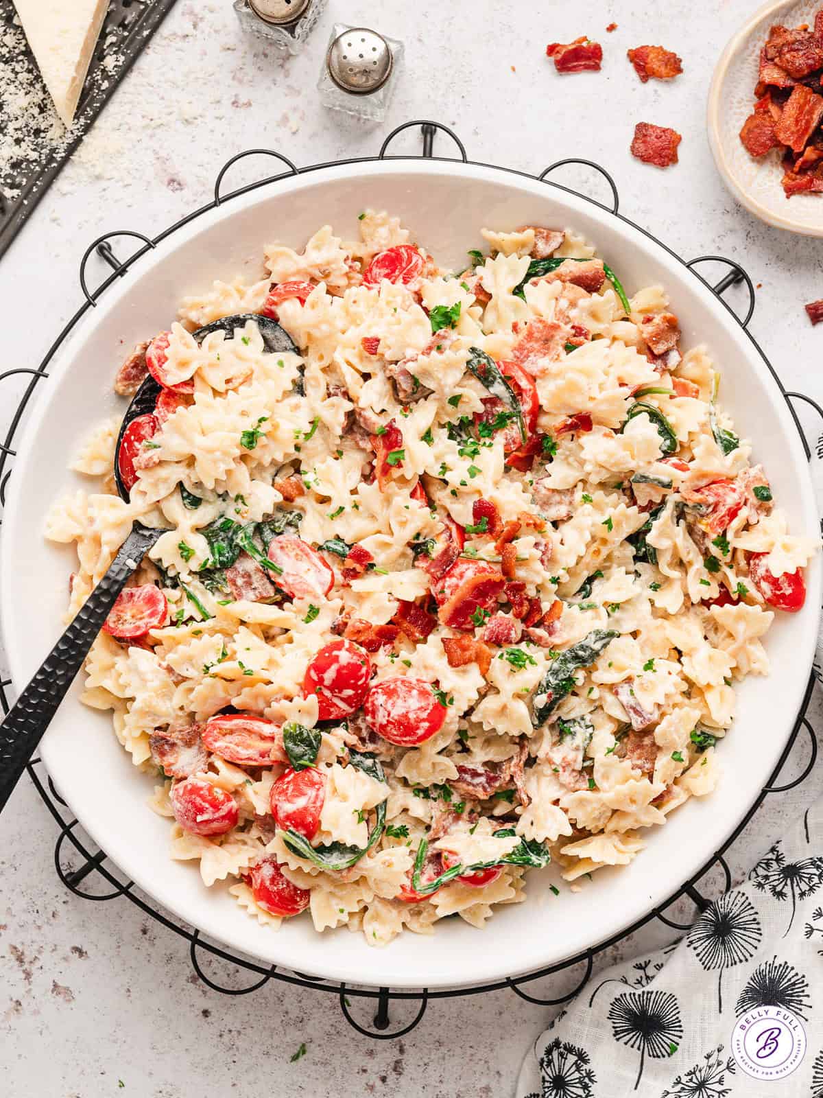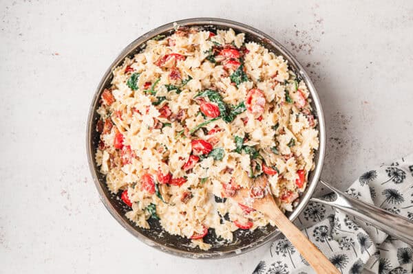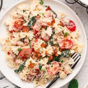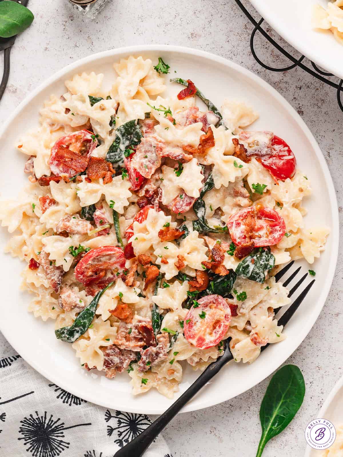 Including tender pasta, crispy bacon, cherry tomatoes, and spinach, in a creamy sauce, this BLT Pasta recipe is a fun twist on everyone’s favorite classic sandwich. It’s so delicious and comes together in less than 30 minutes, perfect for busy weeknights!