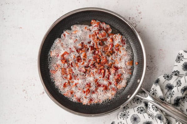 - In the meantime, heat 1 & 1/2 tablespoons olive oil in a large nonstick skillet over medium-high. Add 1 pound diced bacon and cook, stirring occasionally, until crispy. With a slotted spoon, transfer to a paper towel-line plate to drain. Pour off all but 1 tablespoon of grease from the pan.