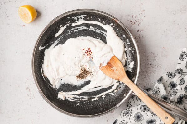 - Stir in 3/4 cup Crème fraîche until loosened, regulating the heat if necessary – you don't want the cream to boil. Then add in 3 teaspoons lemon juice, 1/2 teaspoon salt, 1/4 teaspoon pepper, and a pinch of red pepper flakes.
