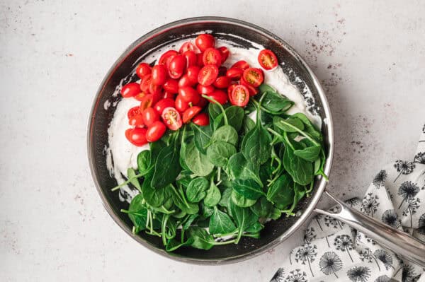 - Add in 2 cups halved cherry tomatoes and 3 cups baby spinach.