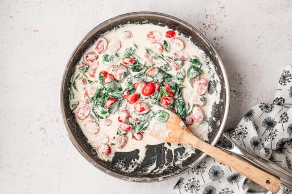 - Mix until spinach wilts and tomatoes just start to soften.