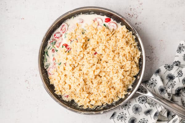 - Toss in the cooked pasta until evenly coated.