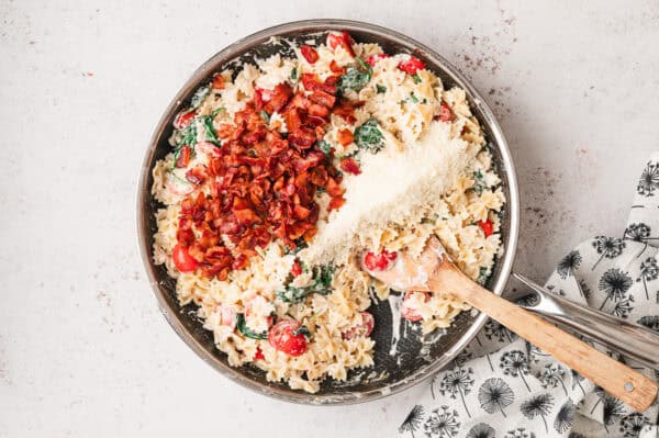 - Stir in 1/3 cup Parmesan and the cooked bacon, reserving some for garnish.