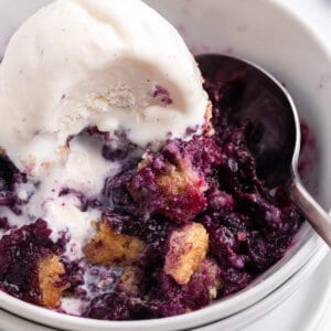 Fresh blueberries will give you the best flavor in this cobbler recipe, but we make this dessert year-round using frozen blueberries when they’re not in season. If using frozen blueberries, they do not need to be thawed before adding them in, but it can increase the baking time slightly and you may need to tent the dish toward the end if you notice the topping is over-browning.
