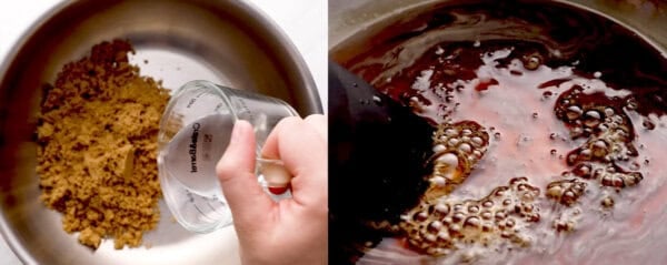 - Place the brown sugar and water into a medium-sized sauce-pot over medium heat; stir together then bring it to a gentle simmer, stirring constantly for 3 minutes (don’t let it reach a rapid boil.) The syrup should be slightly thickened. Remove from the heat to cool.