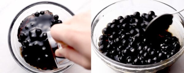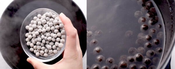- Cook the tapioca pearls per the directions on the packaging. (Test a pearl to see if it’s your desired level of softness – continuing cooking a few more minutes if they’re still stiff.) Remove the tapioca pearls from the heat; drain and rinse pearls under cold water to prevent them from sticking together and transfer to a bowl.