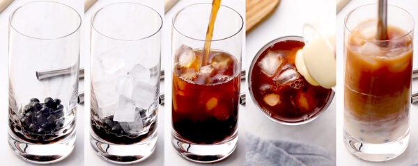 - To serve, add the sweetened tapioca pearls along with a bit of the syrup to the bottom of four tall glasses. Top with ice. Add 1 cup of the tea to each glass. Add 1-2 tablespoons of sweetened condensed milk to each glass. Gently stir to combine.