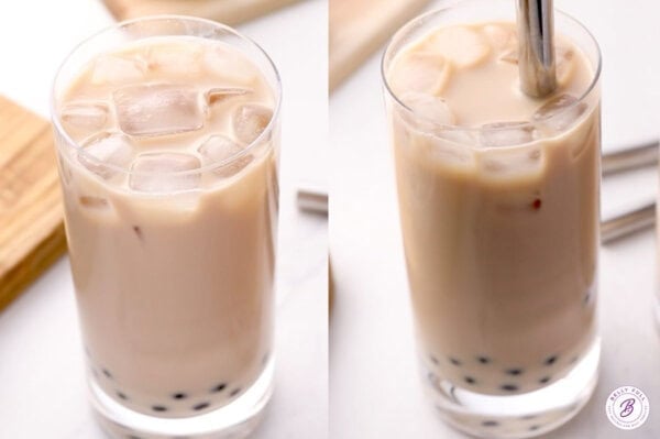 Bubble tea is typically served over ice, with some of the brown sugar syrup added in with the tapioca. If you want it sweeter, add a bit more of the brown sugar syrup to the glass. You can also add simple syrup to your taste, for a sweeter drink.