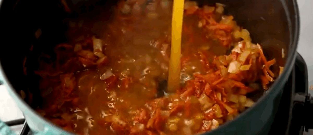 - Pour in vegetable broth and water. Bring to a boil, then add potatoes. Season with salt and pepper and simmer for 10 minutes.