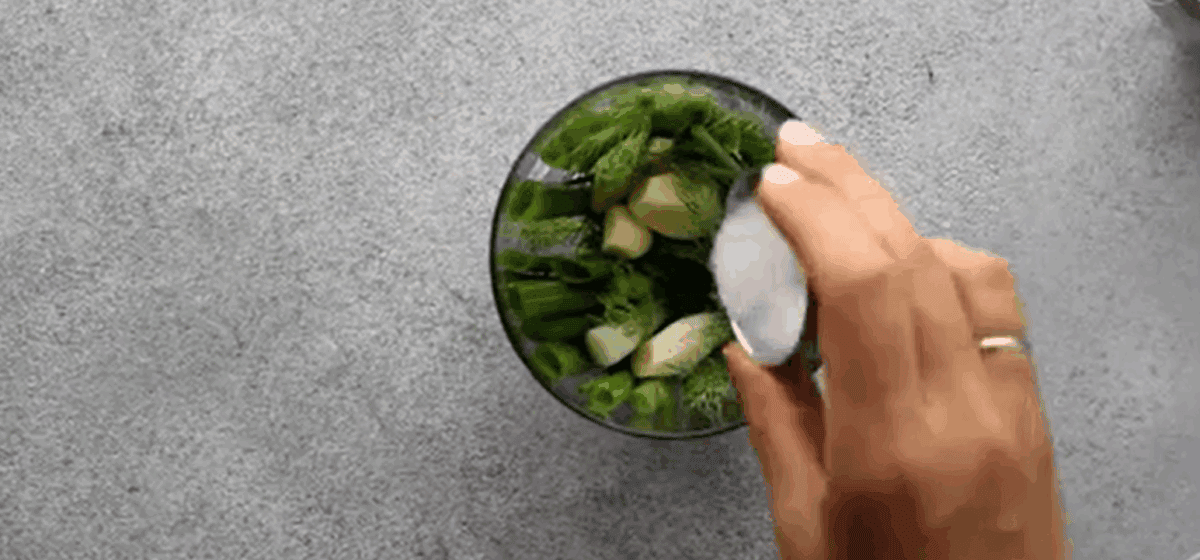 Blend the herb paste: Using a small blender or immersion blender, blend a small bunch of dill, 2 scallions, 4 cloves garlic, 1 tbsp sugar, and a pinch of salt until it forms a paste. (Alternatively, you can just mince the herbs and garlic together with a knife and stir in the sugar and salt.)