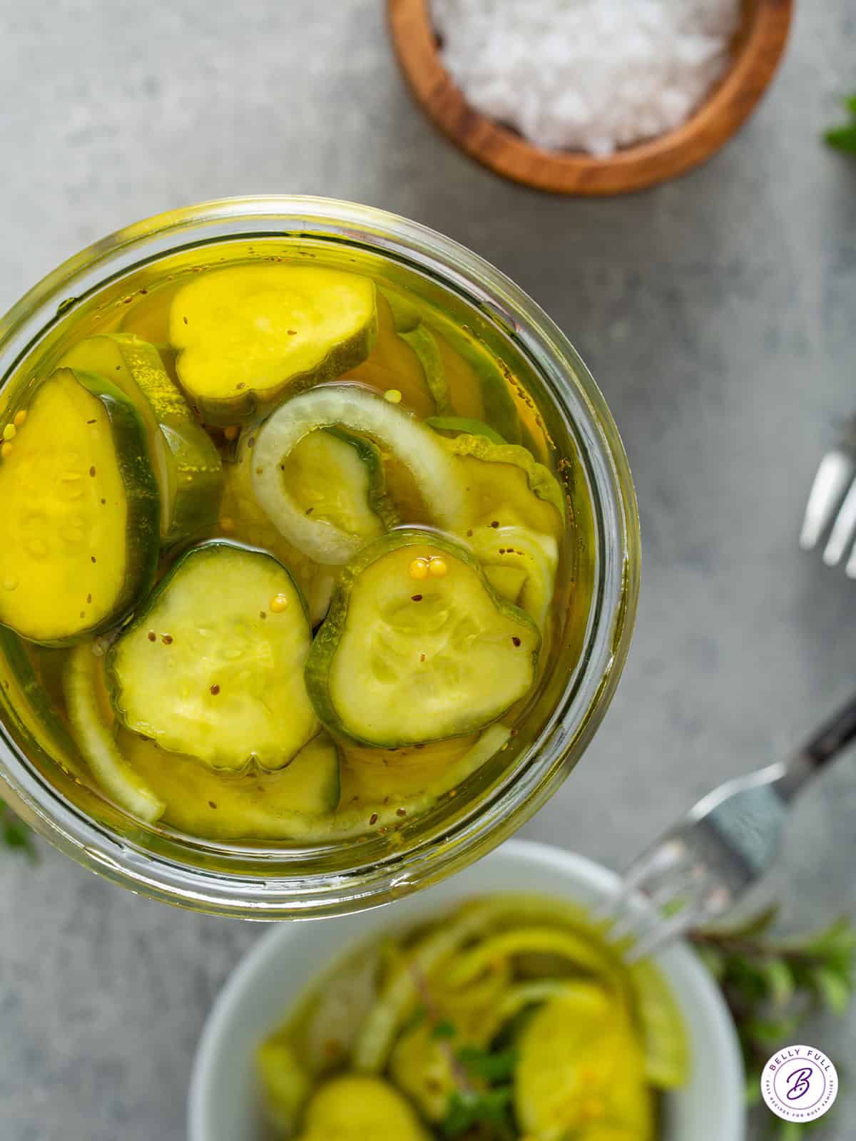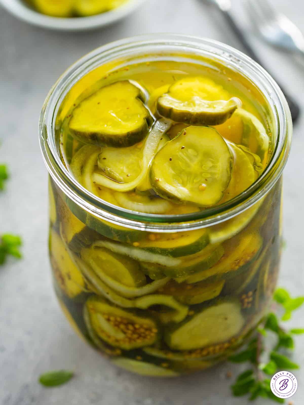 - The thickness of the slices matter. The cucumber slices should be about 1/4-inch thick. You want some crunch! Too thin and they can disintegrate when soaked with the hot brine. Too thick and they won’t soak up the brine enough.