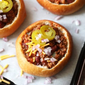 Scoops of homemade chili in hollowed out small dinner rolls, then baked and served with your favorite toppings! You can eat your chili and the bowl, too!