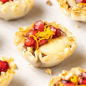 Mini phyllo shells are filled with jam, brie cheese, walnuts, and pomegranate seeds, making these Jam and Brie Phyllo Bites an easy and beautiful holiday party appetizer!