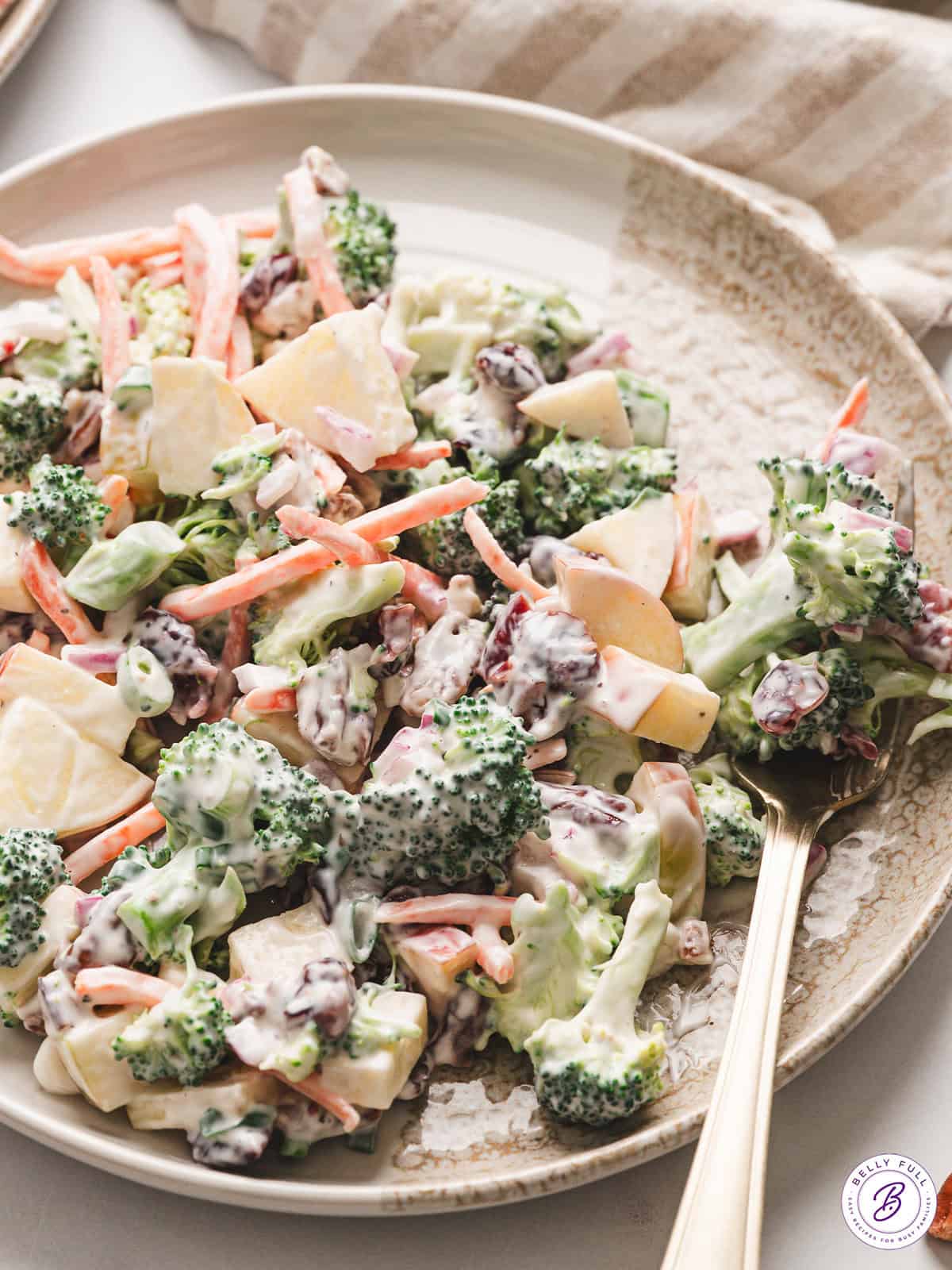 - Small pieces. Everything added to the salad should be chopped, sliced, or diced into smaller than bite-sized pieces – especially the broccoli and apple. This helps ensure that every bite has multiple flavors and textures.