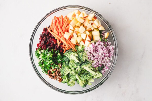 - In a large bowl, mix together 4 cups small broccoli florets, 2 chopped sweet apples, 1/2 cup shredded carrots, 1/4 cup diced red onion, 1/2 cup dried cranberries, 1/3 cup chopped toasted pecans, and 2 diced scallions.